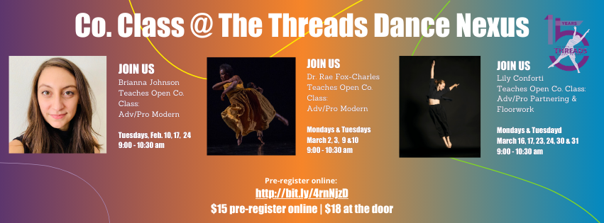 This Feb & March Tapestries 10.0 Choreographers will be teaching Open Co. Class 9-10:30 on select Mondays and Tuesdays @ The Nexus. Pre-register online to claim your spot and save money! These classes are for Adv./Prof. Adult dancers. For more information please email aericson@threadsdance.org.